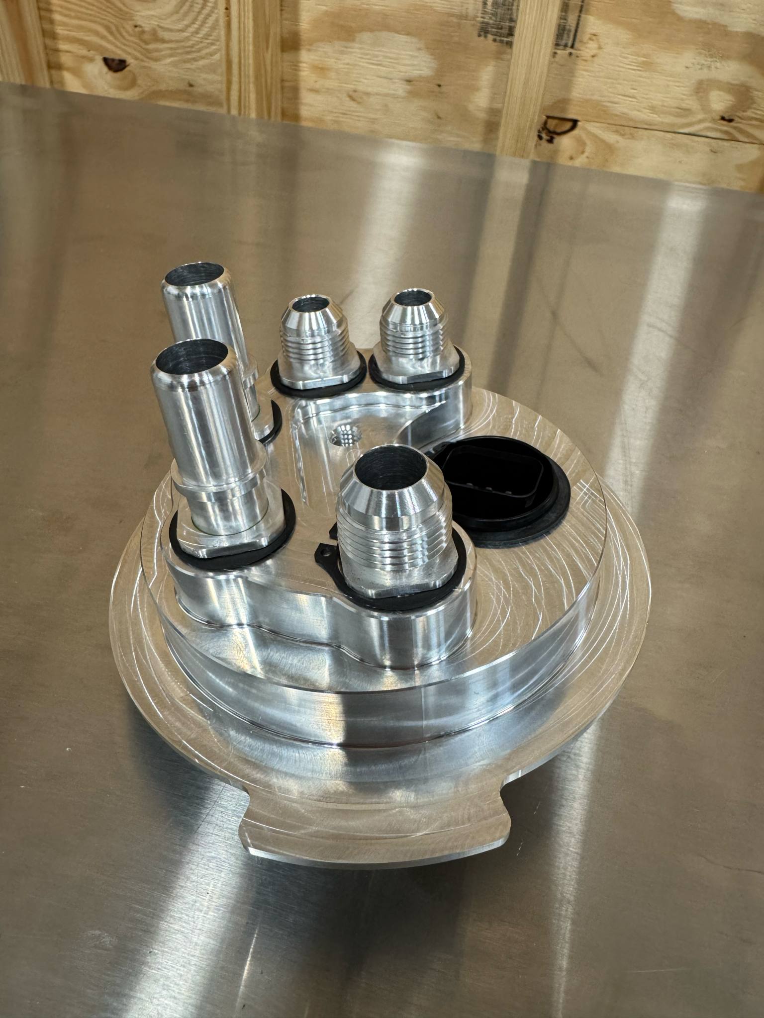 You may have seen similar looking fuel hats/systems on the market, but ours is different because it encapsulates the fuel pumps and functions as a surge tank in that the factory fuel pump feeds to our hat, and we then feed the factory high pressure pump and fuel rails (if you have port injection). This is done via one fuel pressure regulator off our hat controlling pressure supply to the factory high pressure pump. The return of that regulator then feeds to the rails (if you have them). The port rail pressure is controlled by a secondary regulator and returns to our hat. This means your port rails are always pressurized, thus providing adequate fuel supply immediately when you fire your port injectors.